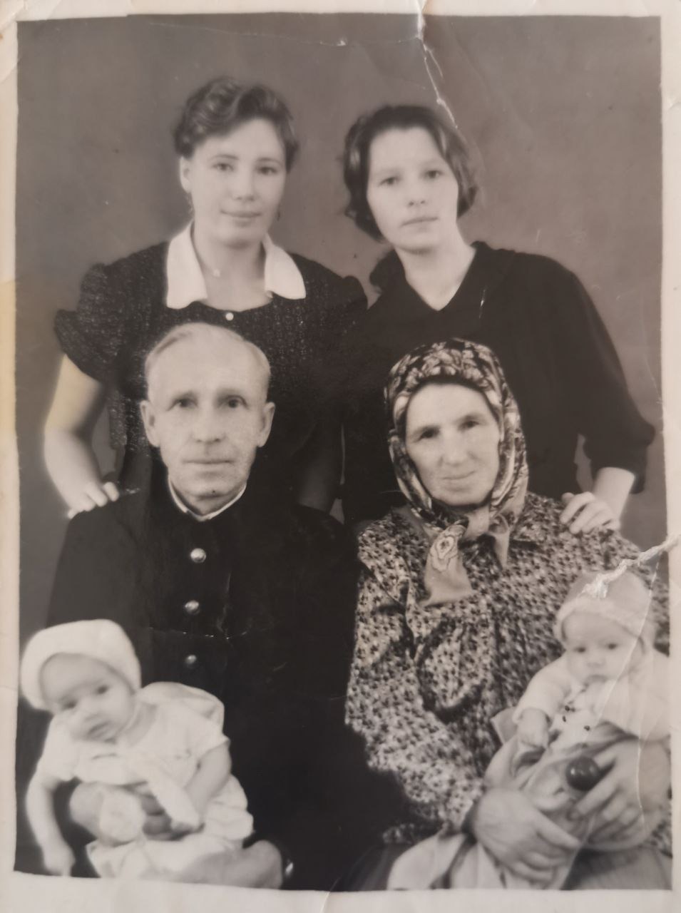 Фотография: За спиной Василия Петровича стоит дочь Лидия Васильевна- мама Ирины Панкрац, которая сидит у дедушки а на руках, на фото ей 3 месяца. За спиной Анастасии Григорьевны (1900г.р) стоит дочь Вера Васильевна, на фото ей 19 лет, а на руках у бабушки сидит дочь Веры- Ирина.