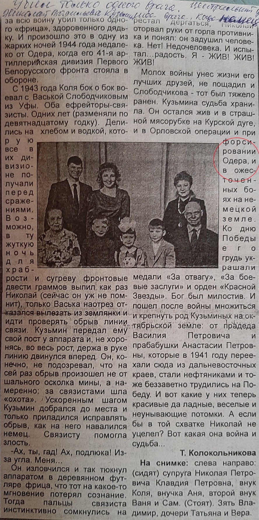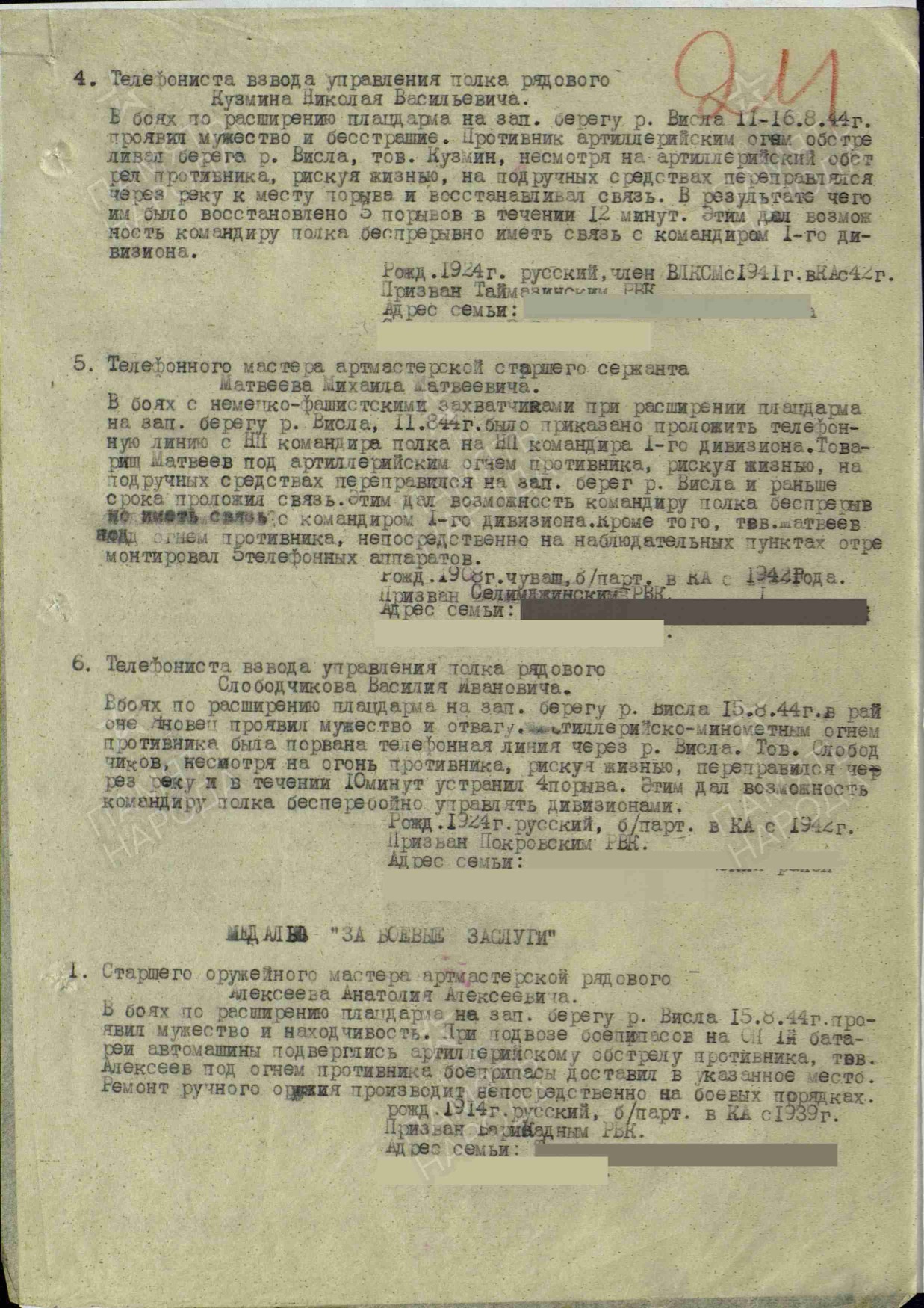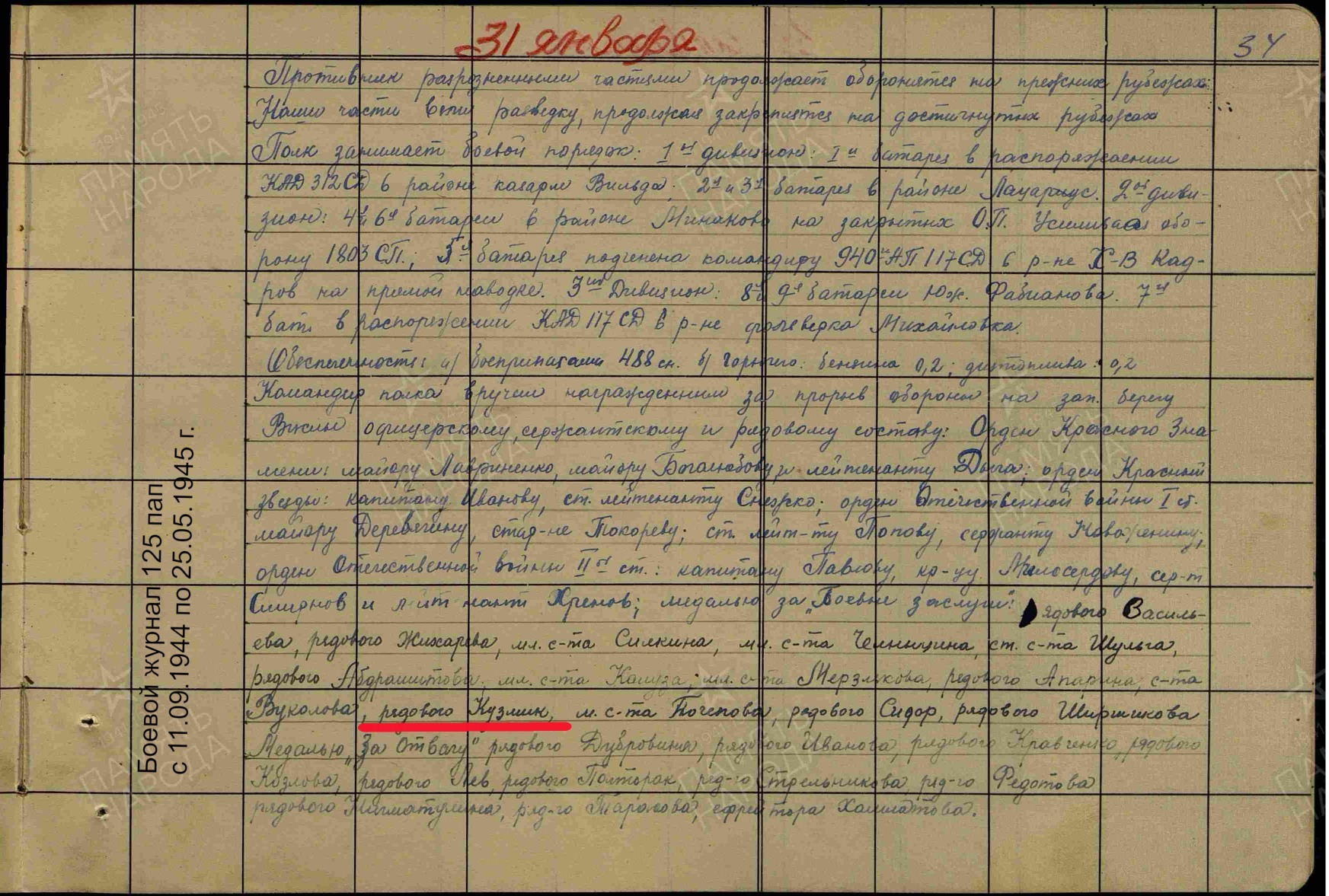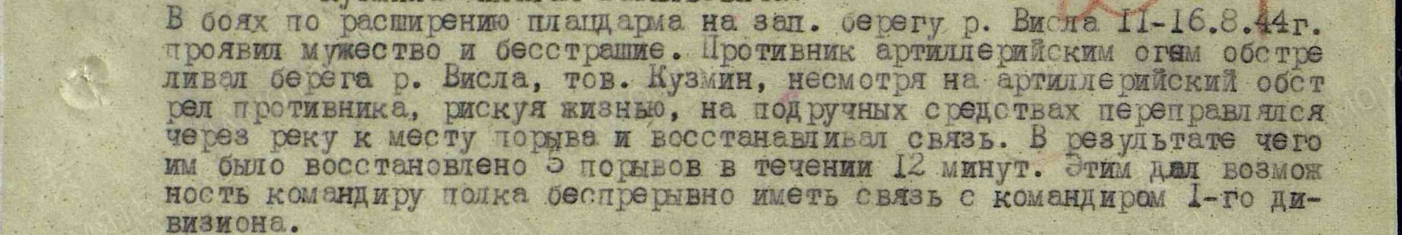МЕДАЛЬ «ЗА ОТВАГУ» СТРОКА В НАГРАДНОМ СПИСКЕ: "4. Телефониста взвода управления полка рядового Кузьмина Николая Васильевича. В боях по расширению плацдарма на западном берегу реки Висла 11- 16.08.1944 года проявил мужество и бесстрашие. Противник артиллерийским огнём обстреливал берега реки Висла, товарищ Кузьмин, несмотря на артиллерийский обстрел противника, рискуя жизнью, на подручных средствах переправлялся через реку к месту порыва и восстанавливал связь. В результате чего им было восстановлено 5 порывов в течении 12 минут. Этим дал возможность командиру полка беспрерывно иметь связь с командиром 1-го дивизиона." Приказ подразделения № 25/Н от 21.08.1944. Издан: 125 пап, 41 пабр, 12 адп РГК 1 Белорусского фронта. Приказ подразделения № 25/Н от 21.08.1944. Издан: 125 пап, 41 пабр, 12 адп РГК 1 Белорусского фронта.