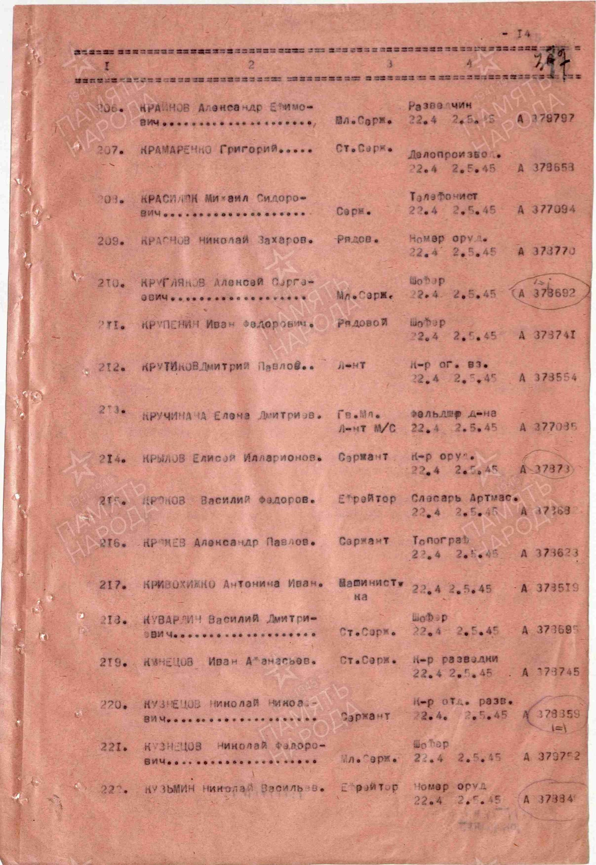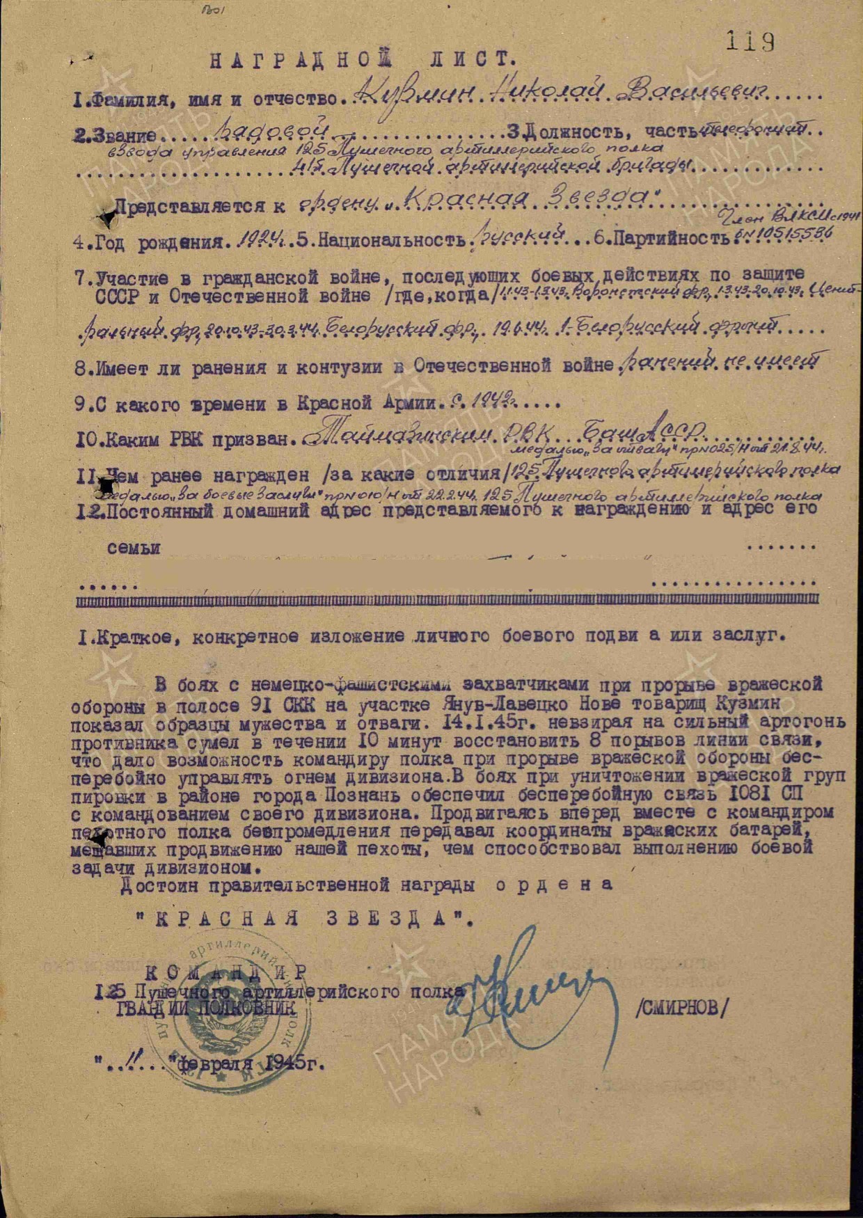 ОРДЕН «КРАСНОЙ ЗВЕЗДЫ» ИЗ НАГРАДНОГО ЛИСТА: "В боях с немецко- фашистскими захватчиками при прорыве вражеской обороны в полосе 91 СКК на участке Янув- Лавецко Нове товарищ Кузьмин показал образцы мужества и отваги. 14.01.1945 года невзирая на сильный артогонь противника сумел в течении 10 минут восстановить 8 порывов линии связи, что дало возможность командиру полка при прорыве вражеской обороны бесперебойно управлять огнём дивизиона. В боях при уничтожении вражеской группировки в районе города Познань обеспечил бесперебойную связь 1081 СП с командованием своего дивизиона. Продвигаясь вперёд вместе с командиром пехотного полка без промедления передавал координаты вражеских батарей, мешавших продвижению нашей пехоты, чем способствовал выполнению боевой задачи дивизионом. Достоин правительственной награды ордена "КРАСНАЯ ЗВЕЗДА". Достоин правительственной награды ордена "КРАСНАЯ ЗВЕЗДА". КОМАНДИР 125 Пушечного артиллерийского полка ГВАРДИИ ПОЛКОВНИК ... ... ... /СМИРНОВ/" Приказ подразделения № 36/Н от 15.02.1945. Издан: 41 пабр.