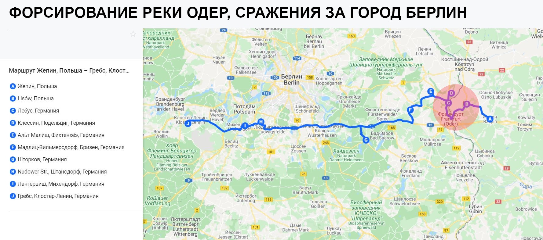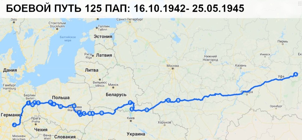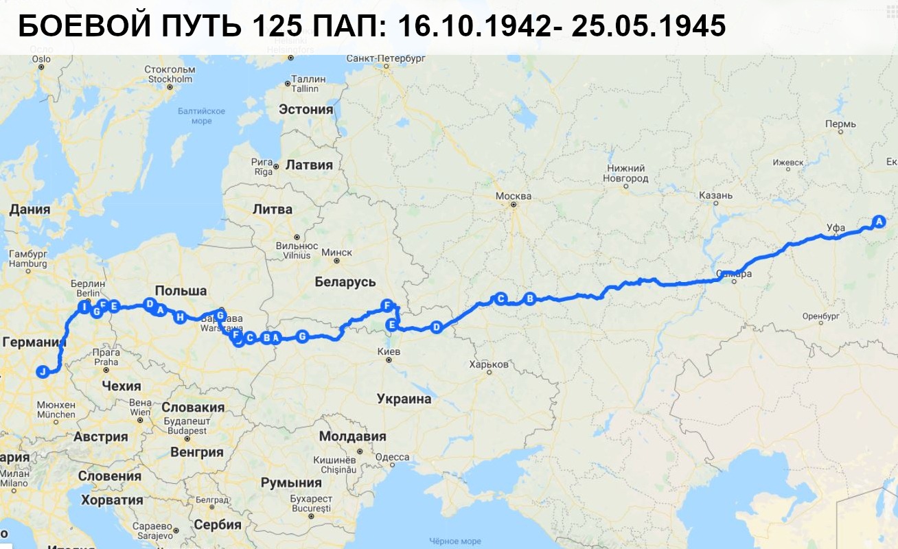 Источник: Боевой Журнал 125 пап: Чебаркуль (Р. Башкортостан)- Берлин (Германия)16.10.1942- 25.05.1945. Google карта.* Источник: Журнал боевых действий 125 пап 16.10.1942- 10.09.1944 г. (Ссылка на документ). Источник: Журнал боевых действий 125 пап 11.09.1944- 25.05.1945 г. (Ссылка на документ). * Маршрут карты носит ознакомительный характер. Составлен с учётом современных дорог.