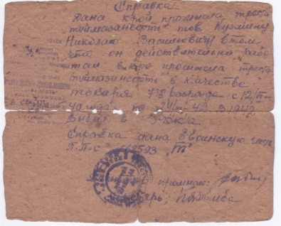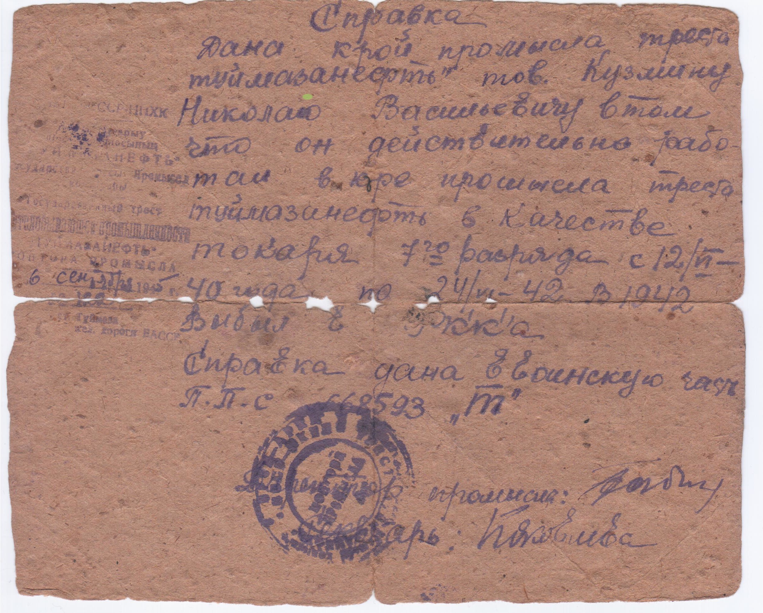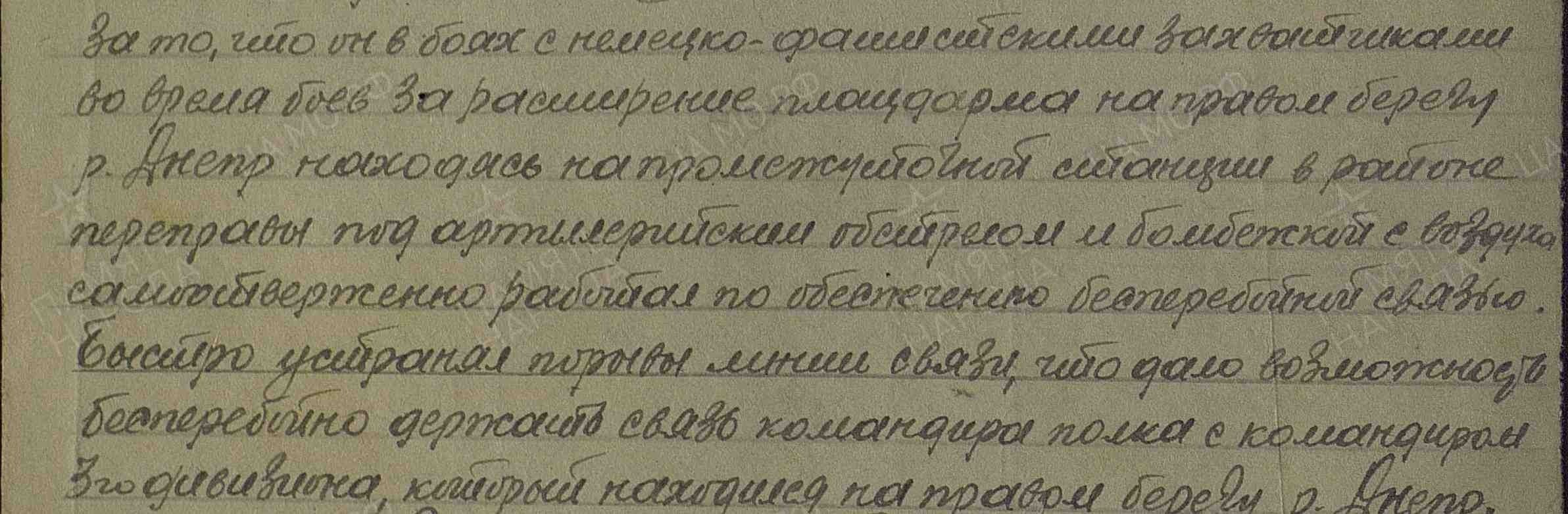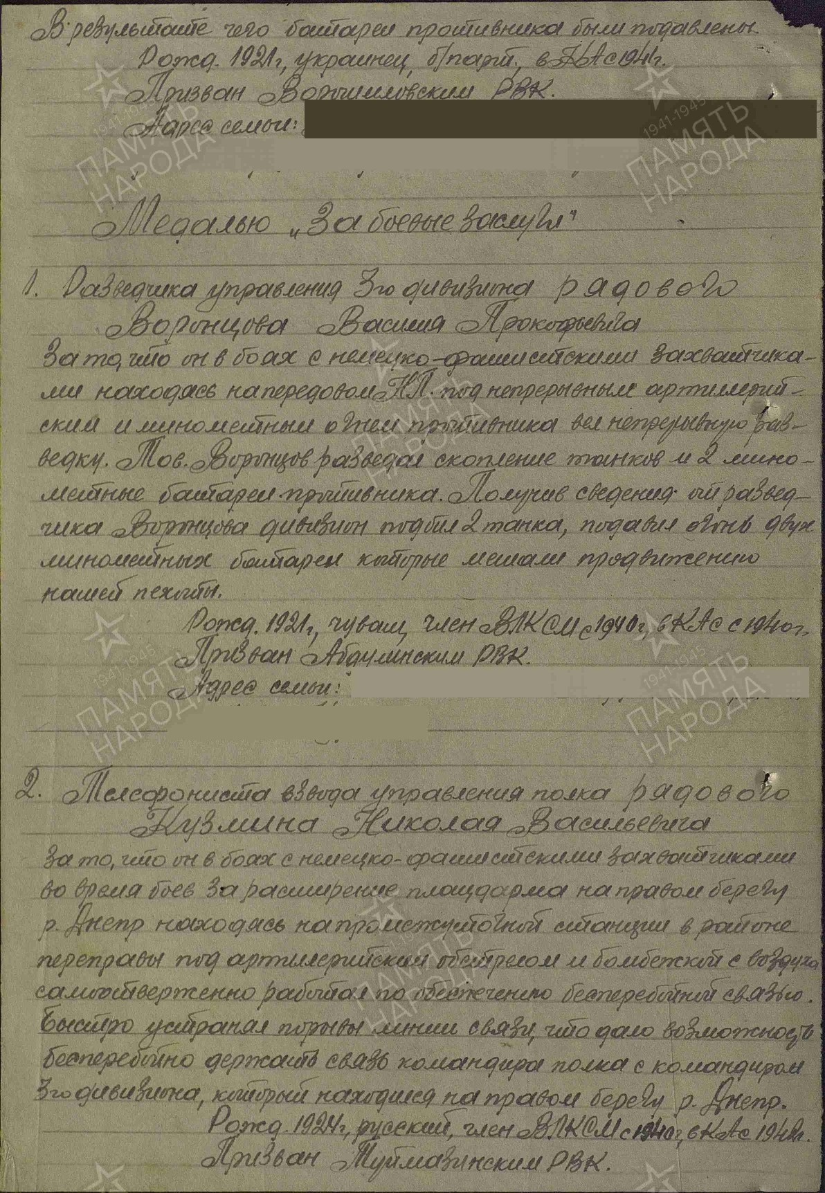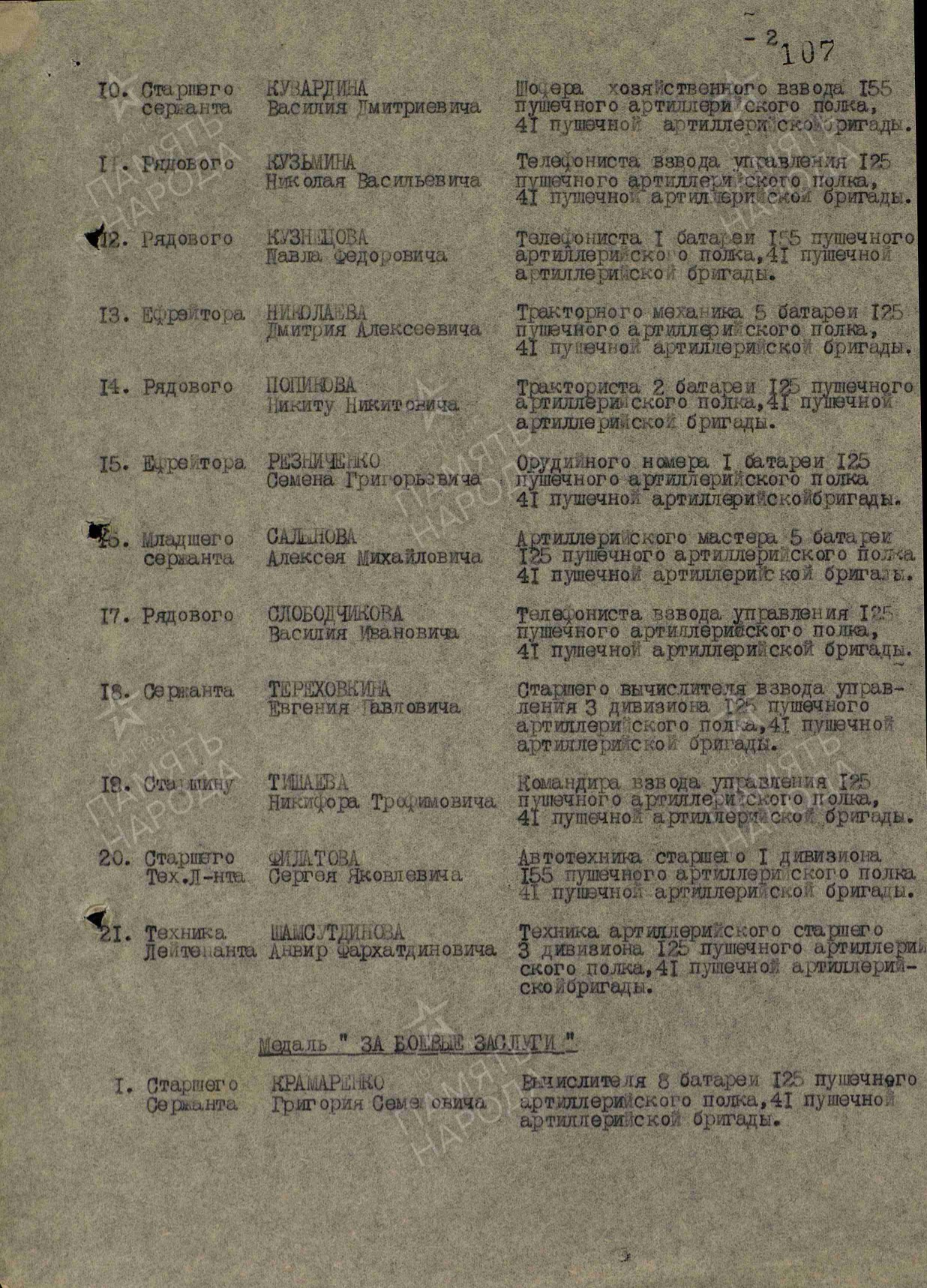 МЕДАЛЬ «ЗА БОЕВЫЕ ЗАСЛУГИ» СТРОКА В НАГРАДНОМ СПИСКЕ: "2. Телефониста взвода управления полка рядового Кузьмина Николая Васильевича за то, что он в боях с немецко- фашистскими захватчиками во время боёв за расширение плацдарма на правом берегу реки Днепр, находясь на промежуточной станции в районе переправы под артиллерийским обстрелом и бомбёжкой с воздуха самоотверженно работал по обеспечению бесперебойной связью. Быстро устранял порывы линии связи, что дало возможность бесперебойно держать связь командира полка с командиром 3-го дивизиона, который находился на правом берегу реки Днепр." Приказ подразделения № 09/Н от 07.11.1943. Издан: 125 пап, 41 пабр, 12 адп РГК. Приказ подразделения № 09/Н от 07.11.1943. Издан: 125 пап, 41 пабр, 12 адп РГК.
