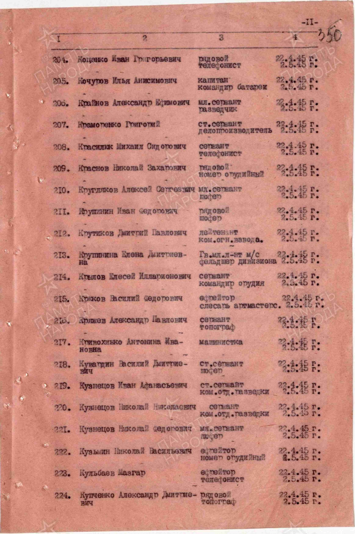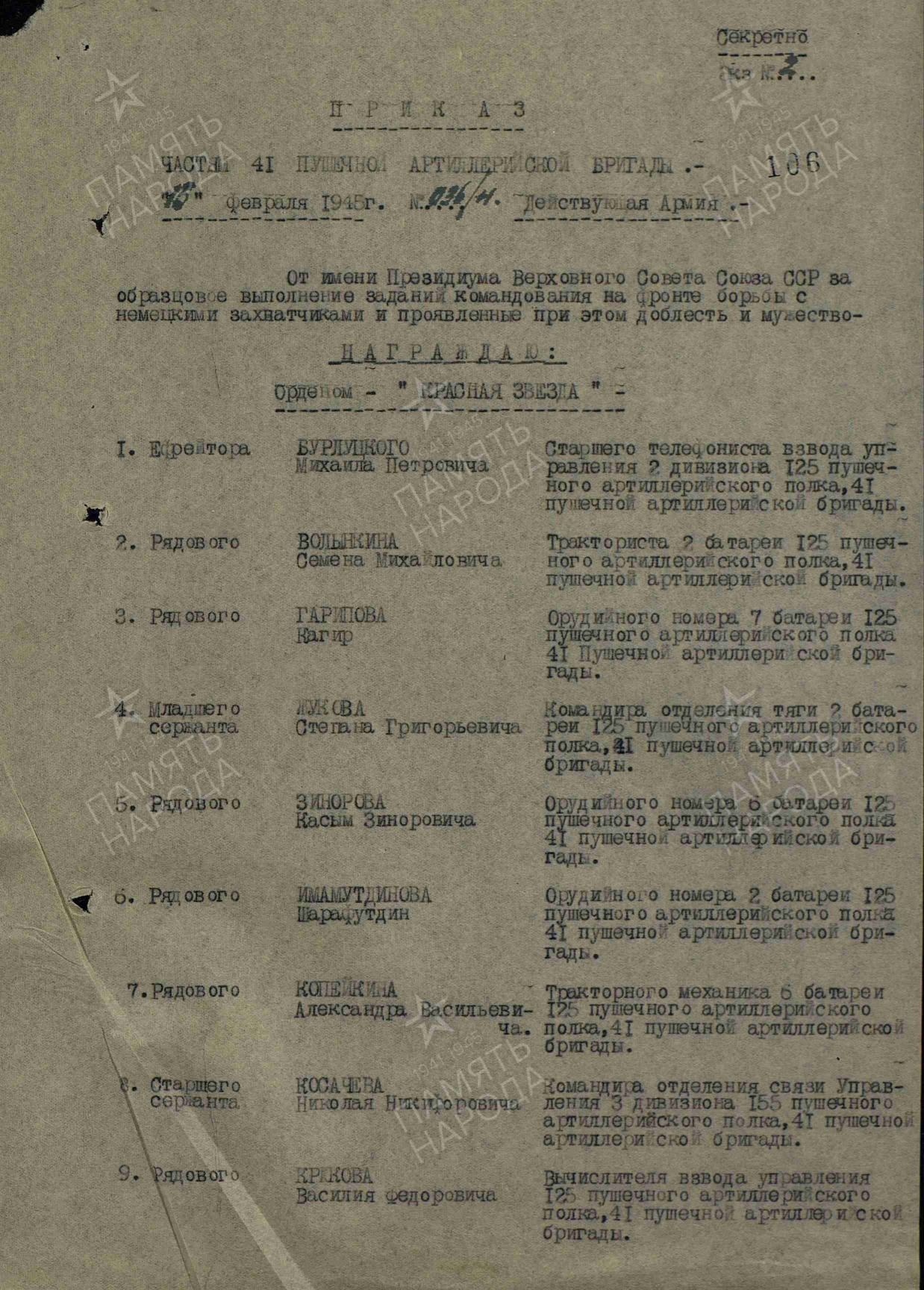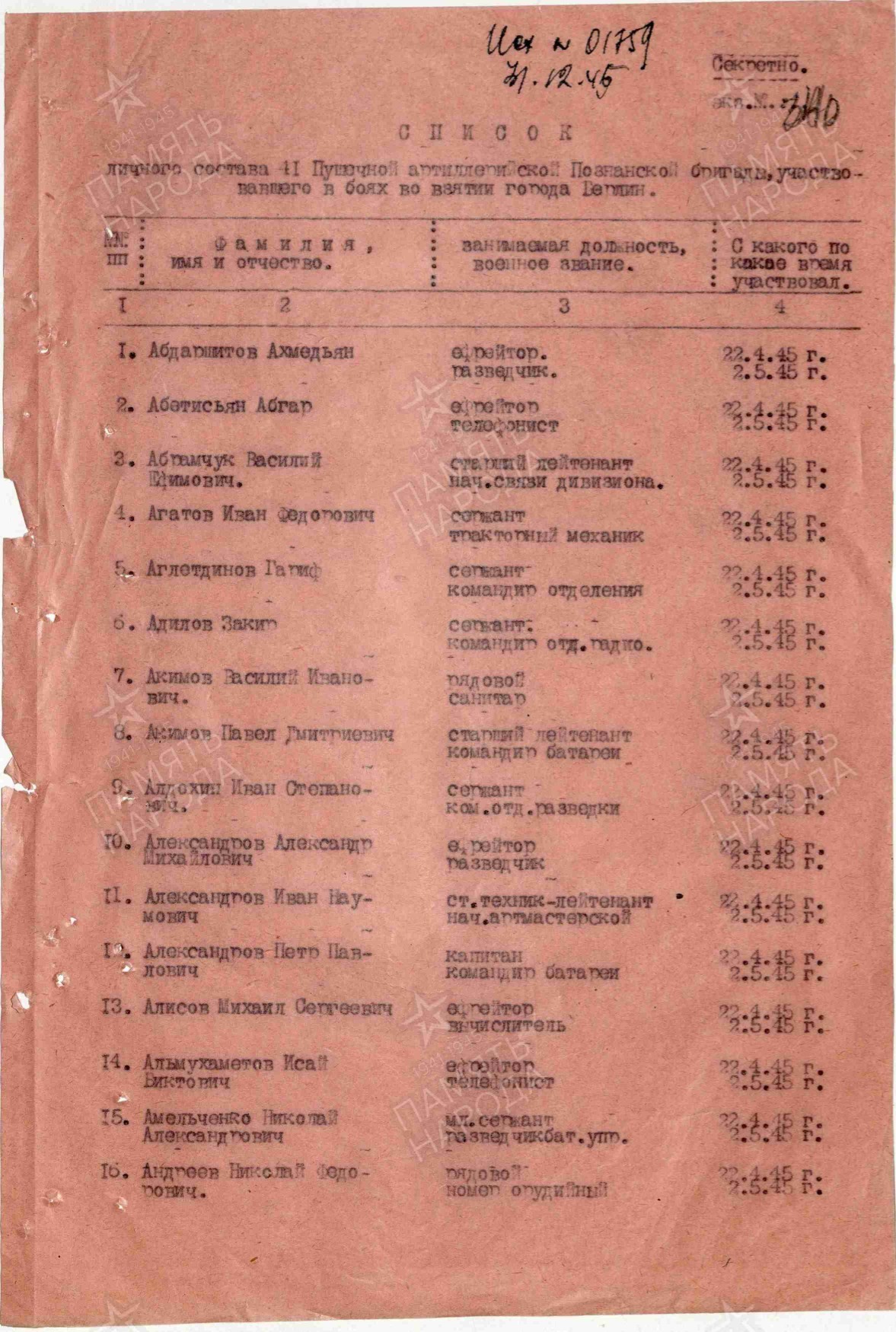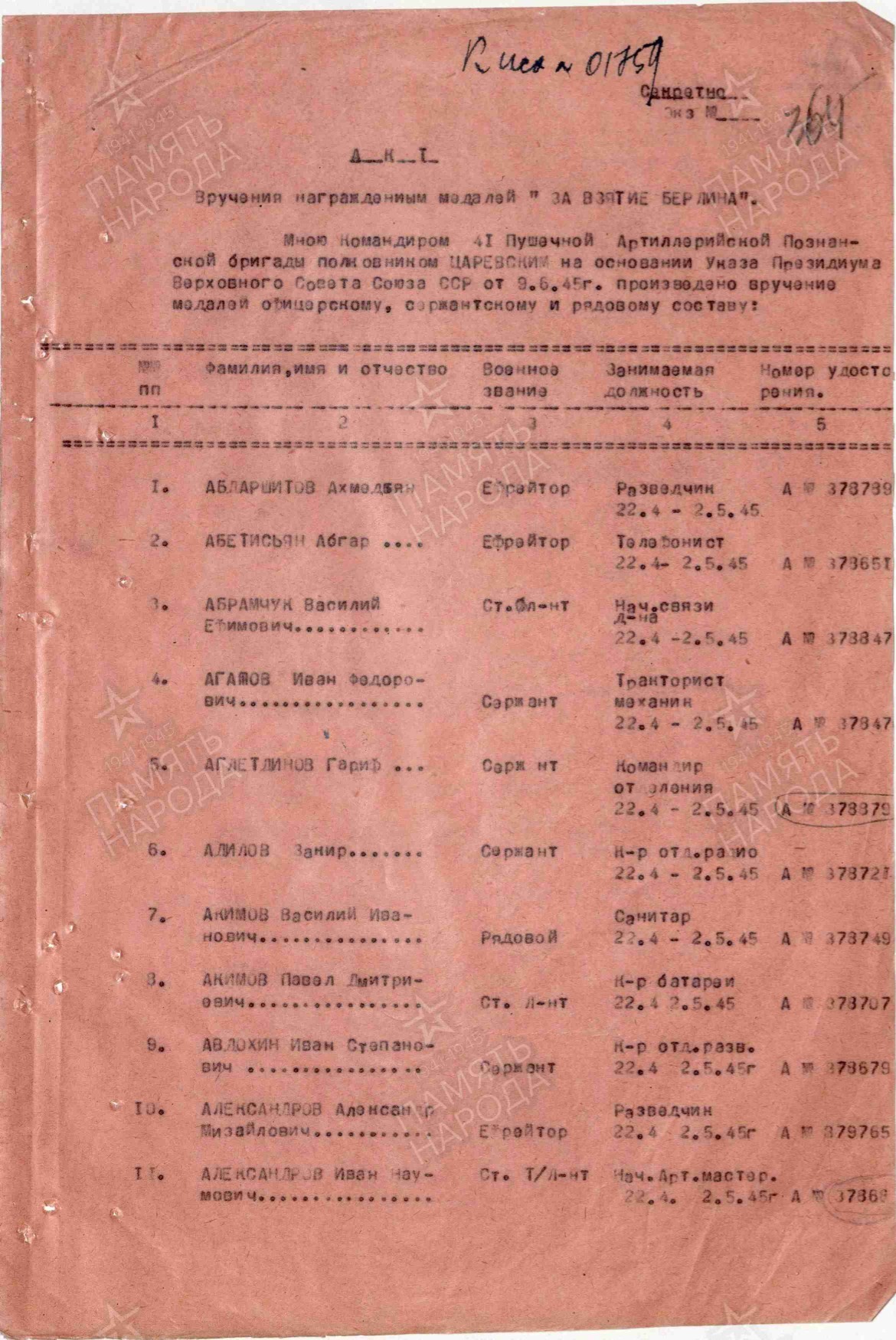 МЕДАЛЬ «ЗА ВЗЯТИЕ БЕРЛИНА» ИЗ СПИСКА ПРЕДСТАВЛЕНИЯ НА НАГРАЖДЕНИЕ: "Список личного состава 41 Пушечной артиллерийской Познанской бригады, участвовавшего в боях во взятии города Берлин. Участвовал с 22.04.1945 по 02.05.1945 г. Приказ подразделения № 1759 от 31.12.1945. Издан: 41 пабр.