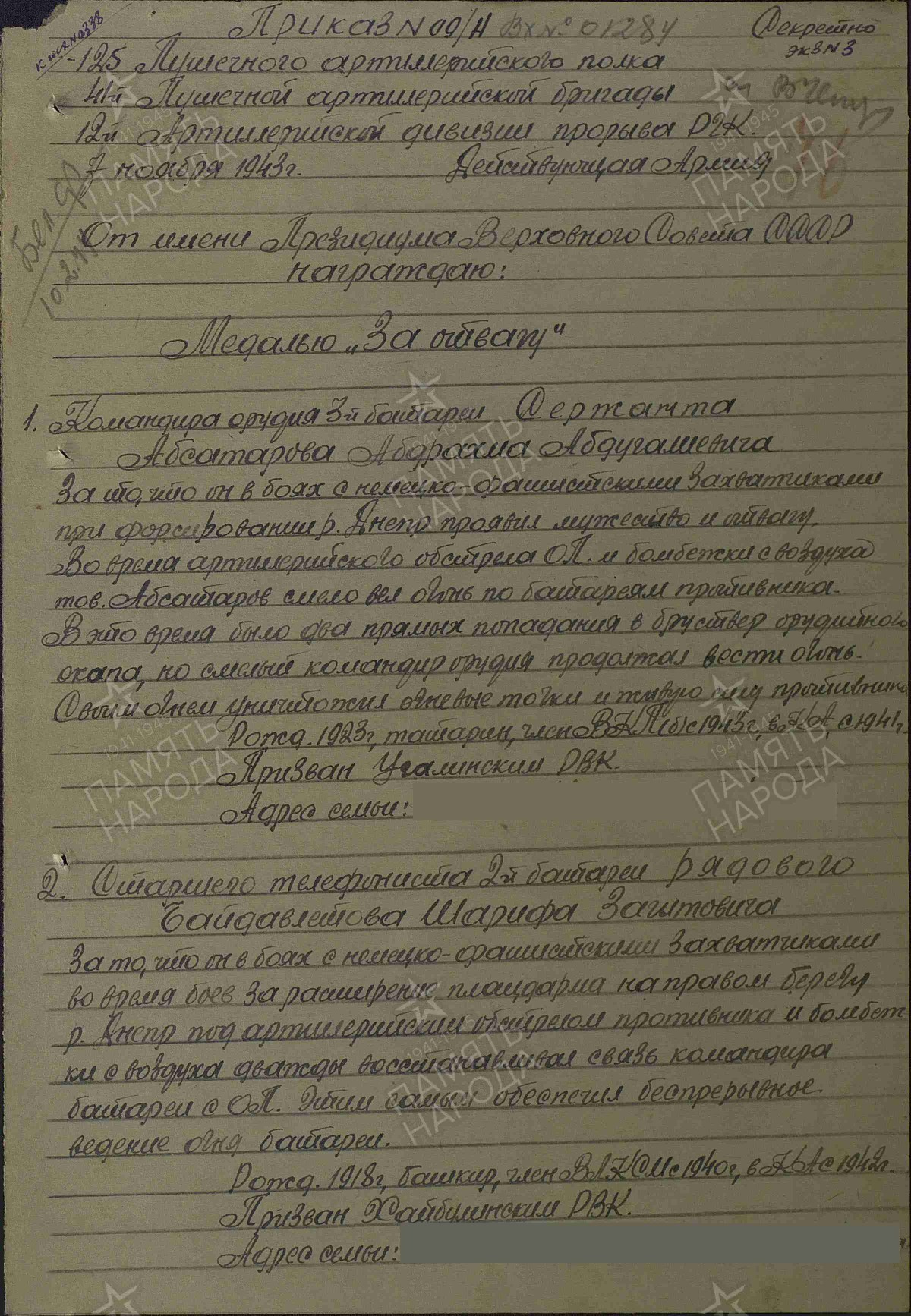 ГОД И МЕСТО РОЖДЕНИЯ:12.05.1924, село Русский Акташ, Акташский район, Татарская АССР. ПРОФЕССИЯ В МИРНОЕ ВРЕМЯ: Токарь 7-го разряда с 12.06.1940 по 24.06.1942, Трест «Туймазанефть» (см "Справка в воинскую часть". Фотография). После войны работал водителем в пассажирском автохозяйстве. ПАРТИЙНОСТЬ: Член ВЛКСМ с 1941 (Номер билета: 10515536). ДАТА И МЕСТО ПРИЗЫВА В КРАСНУЮ АРМИЮ: ≈ 21.11.1942 (см "Журнал боевых действий 125 пап" 1942- 1944г. стр 1), Туймазинский Районный Военный Комитет (РВК), Туймазинский район, Башкирская АССР. ВОИНСКОЕ ЗВАНИЕ, СПЕЦИАЛЬНОСТЬ, БОЕВОЕ ПОДРАЗДЕЛЕНИЕ: Рядовой, Ефрейтор (≈ c 15.02.1945). Телефонист взвода управления 125 пушечного артиллерийского полка, 41 пушечной артиллерийской (Познанской ≈ c 15.02.1945) бригады. РАНЕНИЯ И КОНТУЗИИ: Ранений нет. Тяжёлая контузия. НАГРАДЫ: Награждён орденом «Красная Звезда», орденом «Отечественной войны II степени», медалями: «За боевые заслуги», «За отвагу», «За взятие Берлина», «50 лет Вооружённых Сил СССР», «50 лет Победы в Великой Отечественной войне 1941—1945 гг.», медаль Жукова.